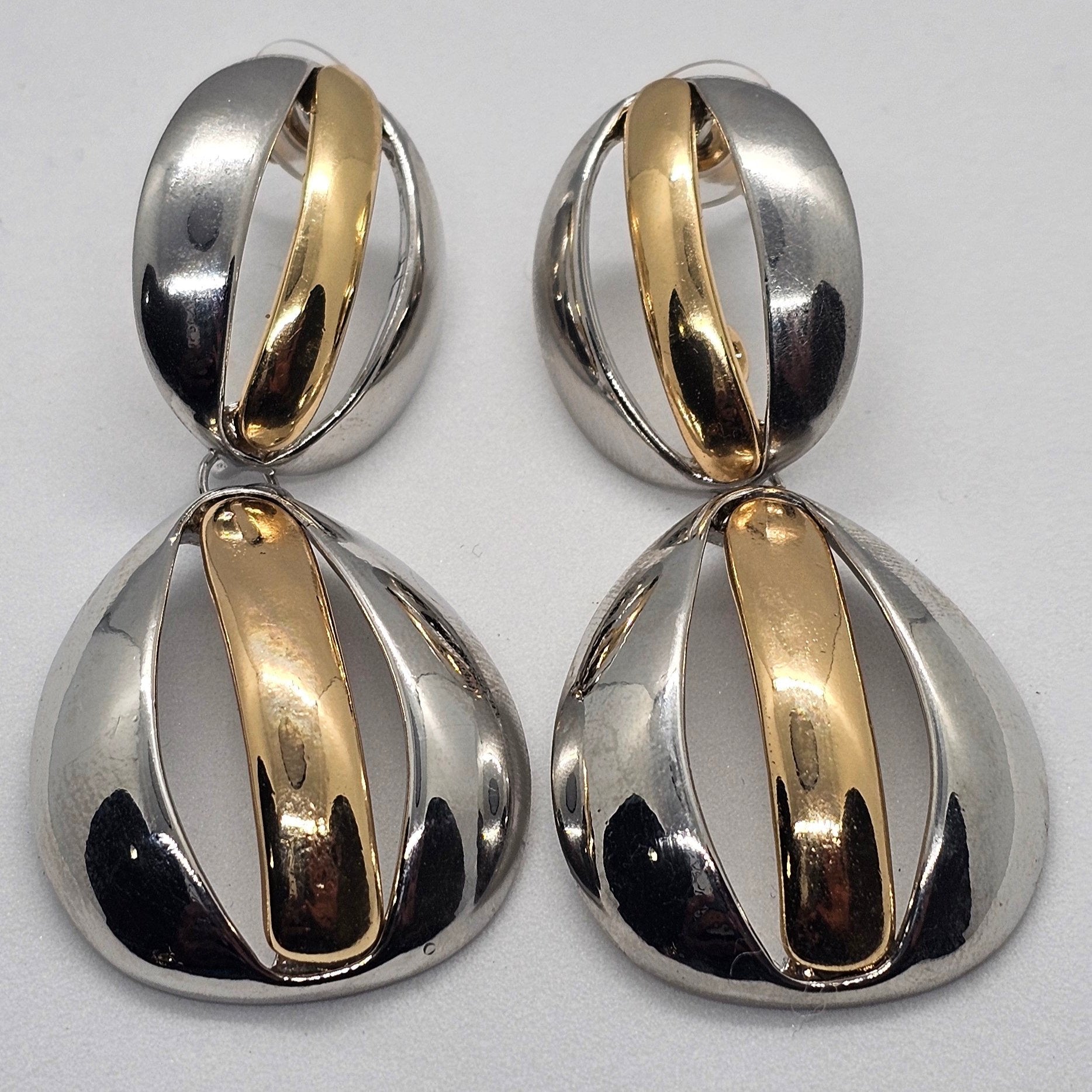 These earrings have a bold and unique design featuring a combination of silver and gold tones. The structure alternates between curved, teardrop-like elements and a sleek, metallic finish that adds an elegant yet modern touch.
